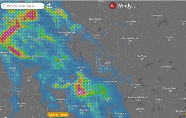 De acordo com a previsão do tempo divulgada via plataforma Windy, as chuvas devem chegar ao Pantanal, especialmente na região de Corumbá (MS), na noite de sábado, avançando pela madrugada de domingo. Há, inclusive, possibilidade de tempestades durante esse período.