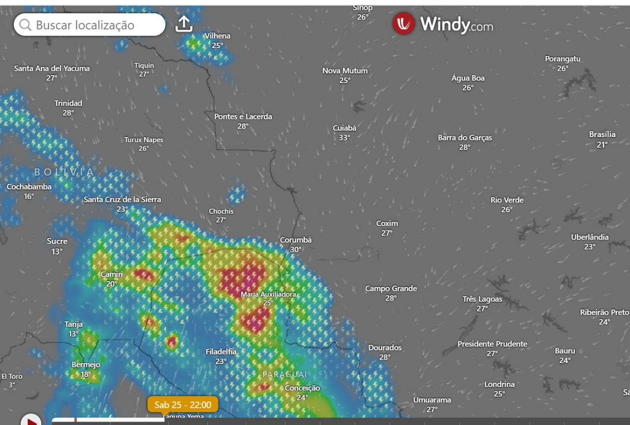 De acordo com a previsão do tempo divulgada via plataforma Windy, as chuvas devem chegar ao Pantanal, especialmente na região de Corumbá (MS), na noite de sábado, avançando pela madrugada de domingo. Há, inclusive, possibilidade de tempestades durante esse período.