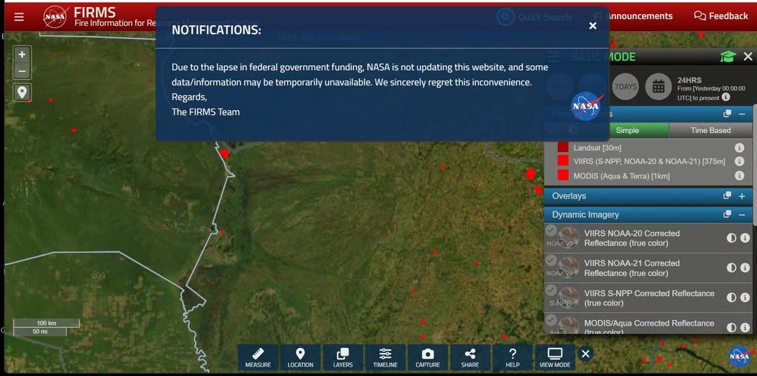 O site da NASA-FIRMS é o que utilizamos diariamente para identificar focos de fogo no Pantanal. Desde ontem nos defrontamos com o seguinte aviso (traduzido): “Devido à interrupção do financiamento do governo federal, a NASA não está atualizando este site, e alguns dados/informações podem estar temporariamente indisponíveis. Lamentamos sinceramente o inconveniente. Atenciosamente, Equipe FIRMS”. Resultado das políticas de Trump. Esperamos que voltem rapidamente.