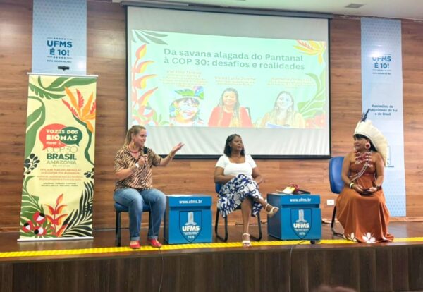 Em sua fala, Nathalia destacou os desafios enfrentados na Bacia do Alto Paraguai, como o desmatamento nas cabeceiras, os incêndios recorrentes e os períodos prolongados de seca na planície pantaneira. Ela também chamou atenção para o papel e a vulnerabilidade das mulheres frente às mudanças climáticas: